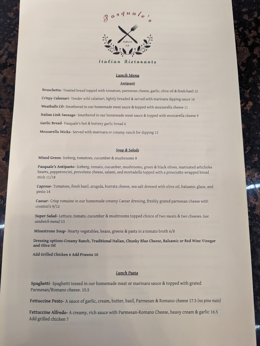 At Auburn Pasquale’s Ristorante Menu, you’ll find a delightful mix of classic Italian dishes, all crafted with the freshest ingredients and served with a warm, welcoming atmosphere. Located at 210 Washington St, Auburn, CA, this cozy spot brings the tastes of Italy right to the heart of California. Whether you're in the mood for a comforting plate of pasta, a crisp, flavorful salad, or something from their rich selection of pizzas, there’s something to satisfy every craving.